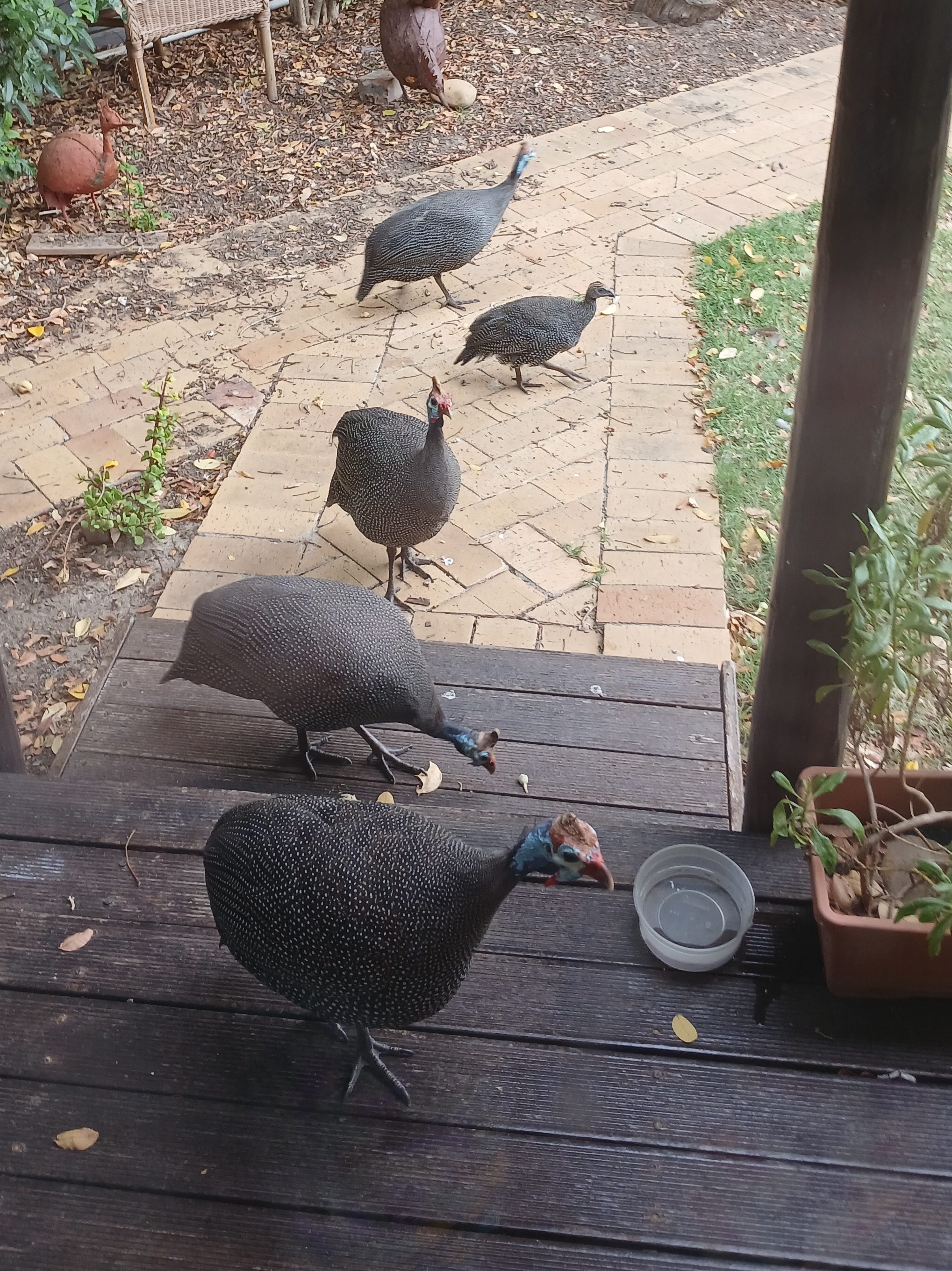 a new brood, that’s life these are guinea fowls, cheeky; here’s the family there’s mom, dad, aunt and uncle and here’s the best one – young’un!