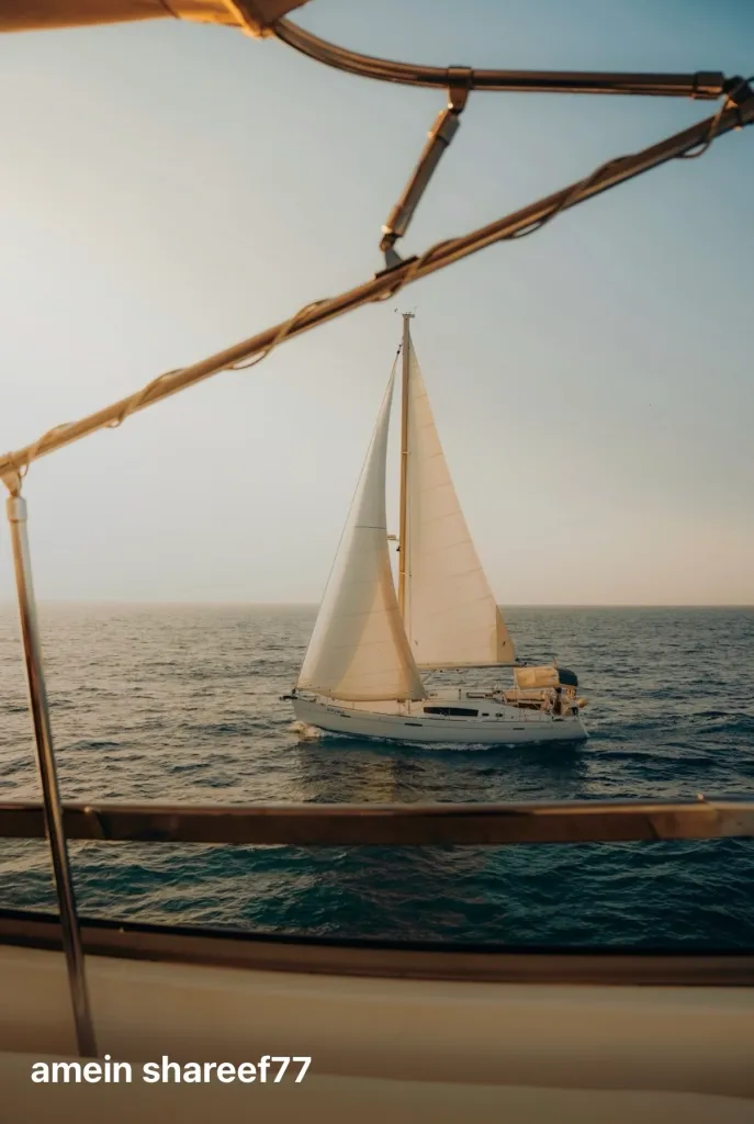 This image shows a sailboat in a vast body of water. The skyline/horizon is clear, and the water is calm. This photo was taken from another boat nearby.