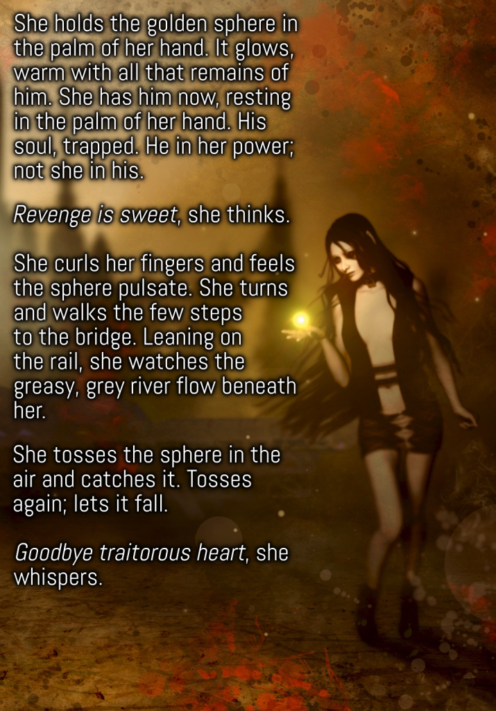 She holds the golden sphere in the palm of her hand. It glows, warm with all that remains of him. She has him now, resting in the palm of her hand. His soul, trapped. He in her power; not she in his.