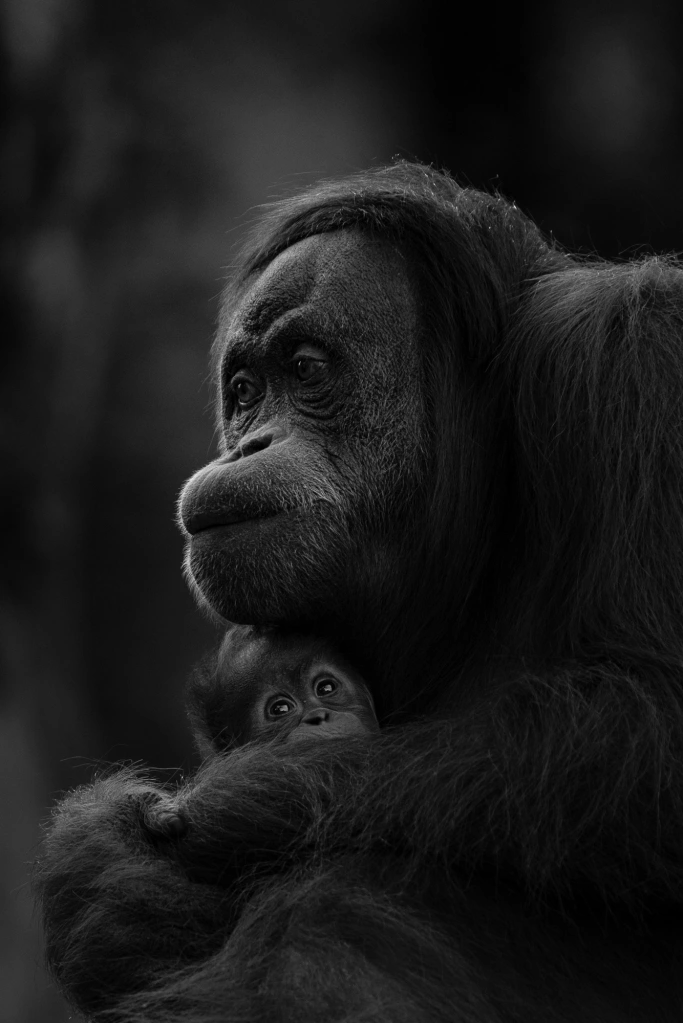 For the visually challenged reader, this image shows a mama orangutan with a baby held very close to her chest.