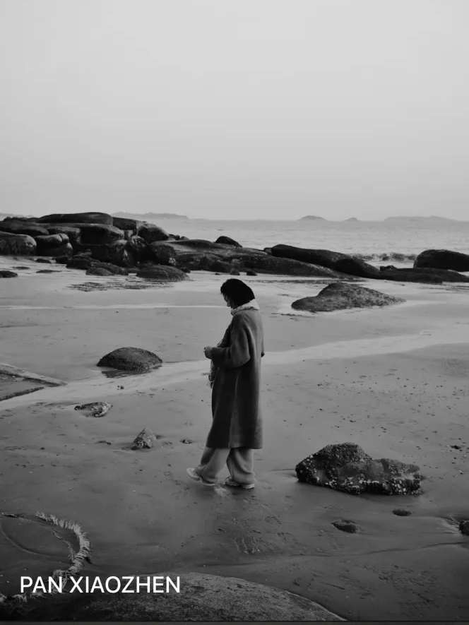 This image shows a fully dressed woman on the edge of a rocky beach. In this black and white photo, she is looking down at something in her hand.