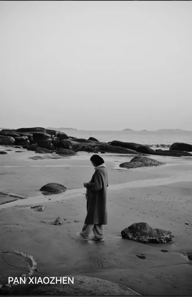 This image shows a fully dressed woman on the edge of a rocky beach. In this black and white photo, she is looking down at something in her hand.