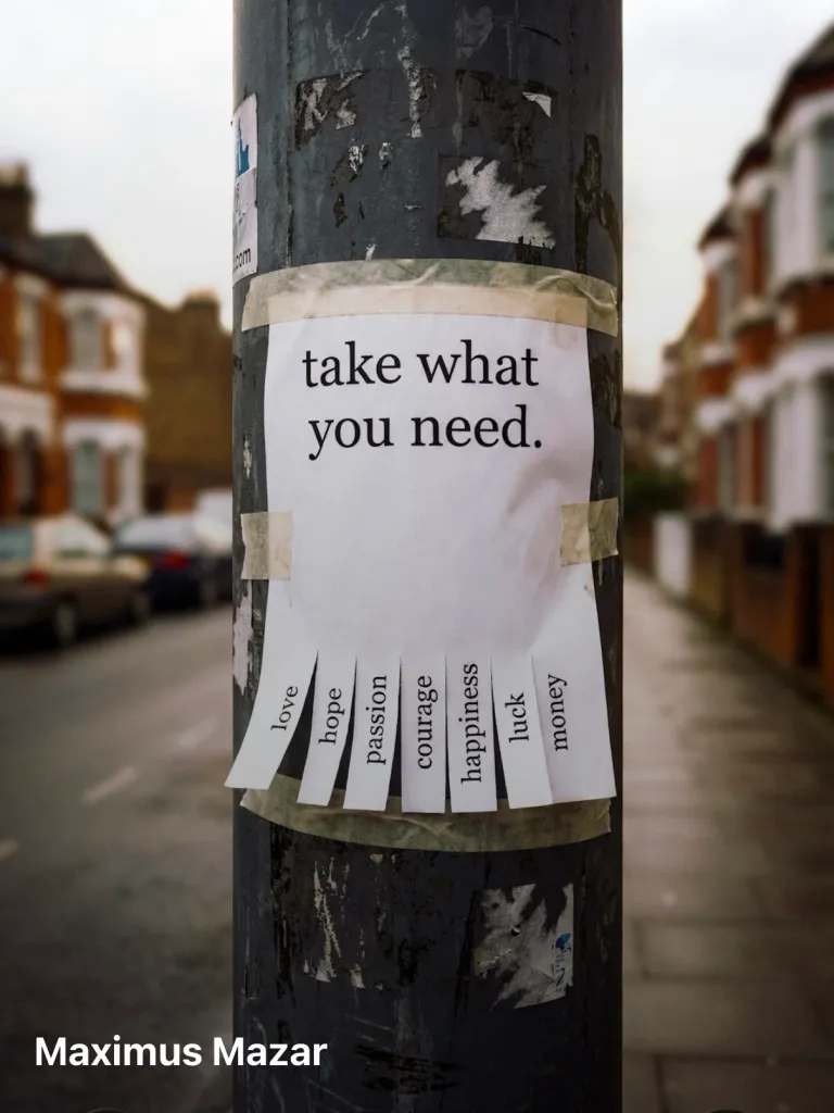 It said, ‘take what you need.’ It was stuck on a telegraph pole by the pavement.