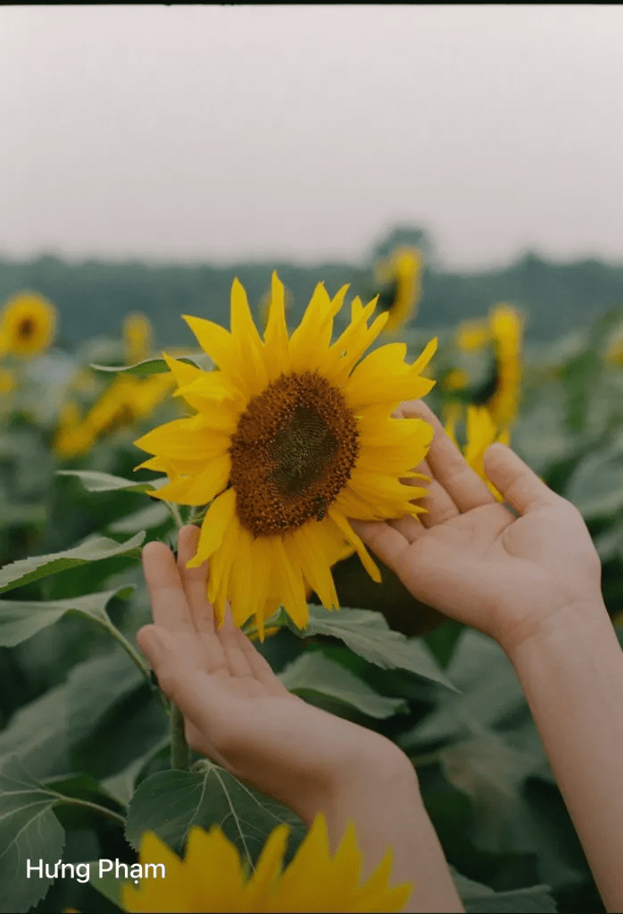 This image shows two hands touching a big sunflower, that is growing in a field of sunflowers.