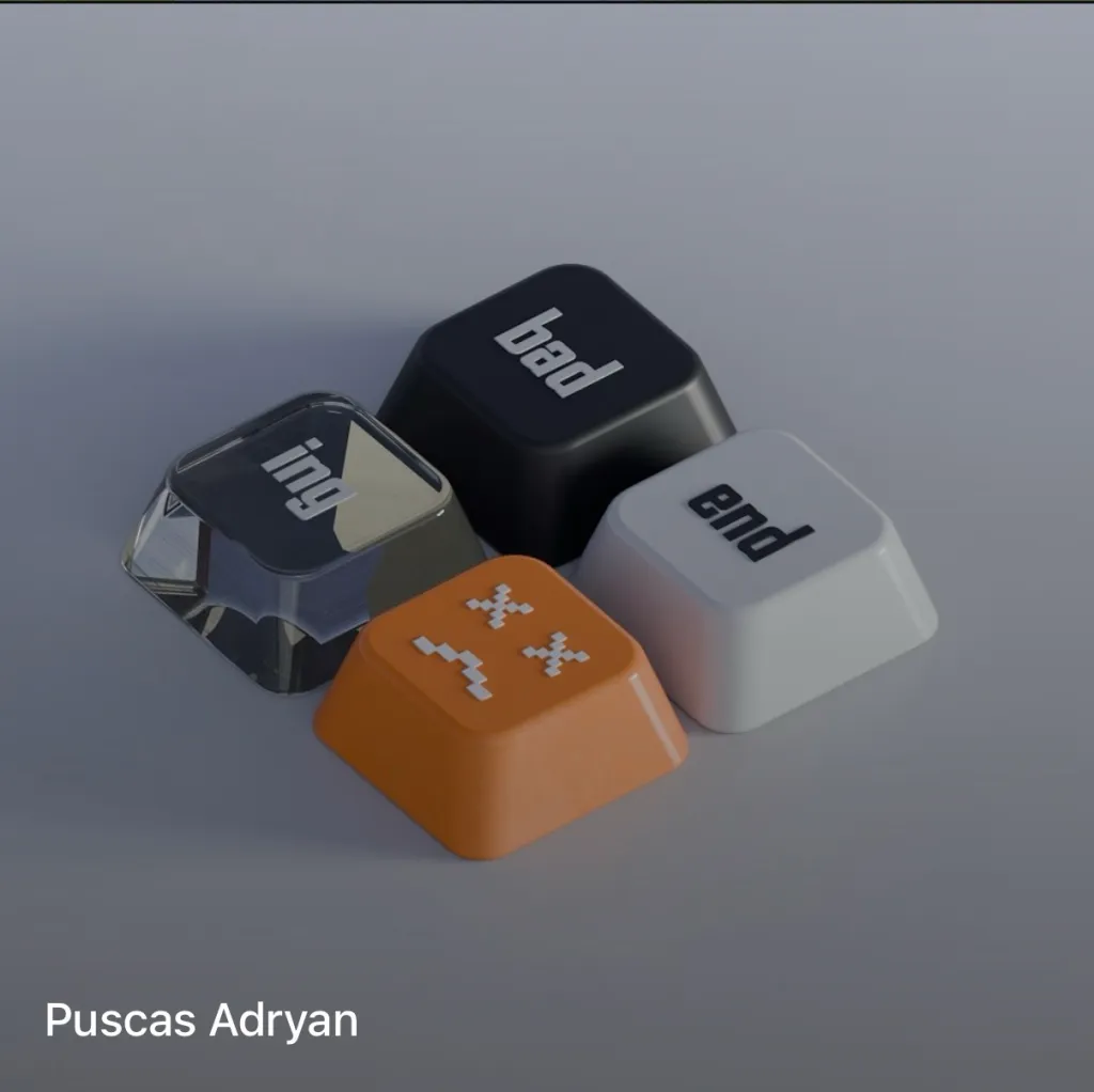 This image shows 4 colourful keys, not usually part of a keyboard. The black one has “bad” printed on it, the white one says “end,” the grey one says “ing,” and the orange one has a sad face.