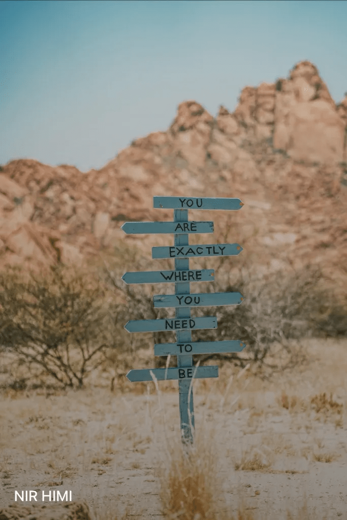 This image shows a sign with arrows pointing in different directions. The message on the arrows say:- “You are exactly where you need to be.” In the background, one can see mountains and a few bushes.