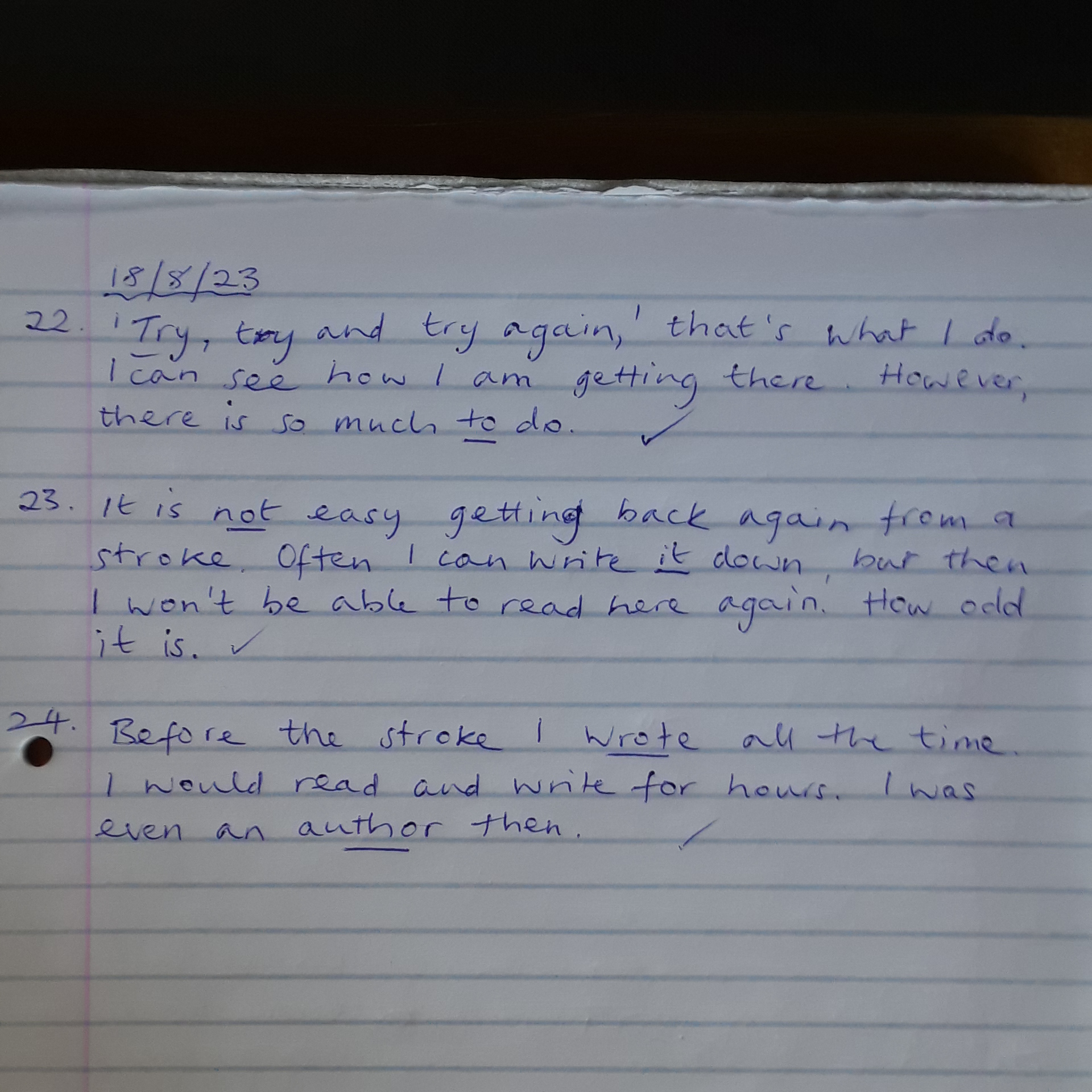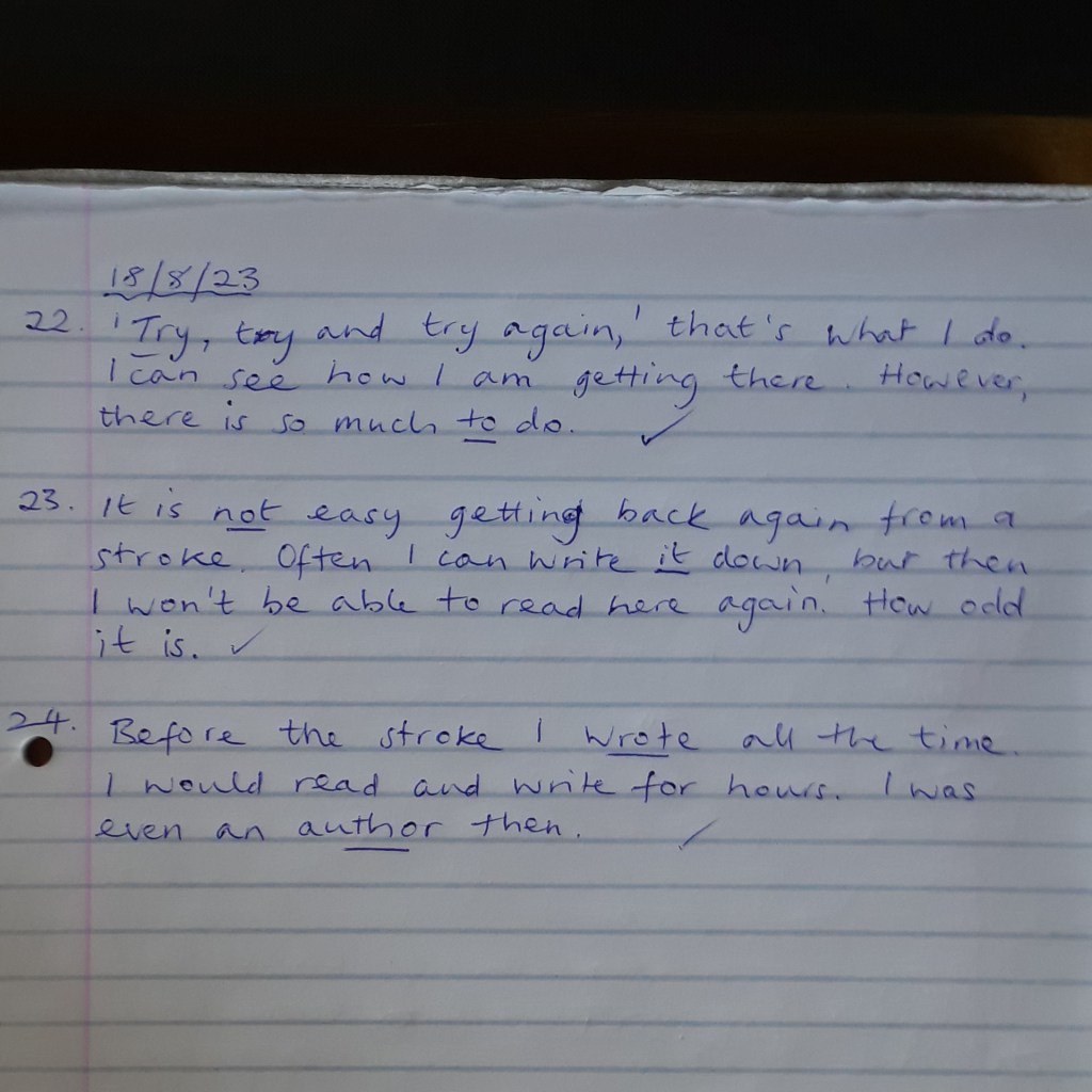 My writing is getting so much better. Reading is still a bit difficult and talking is the same. Sometimes it is perfect but other times it disappears. Oh well.