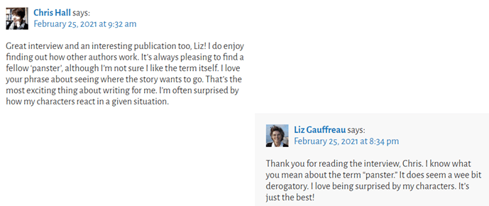 I’m not alone, as discovered last week after I read an interview with fellow author and blogger, Liz Gauffreau. I’m always interested to read about other writers. This brief(!) exchange followed:
