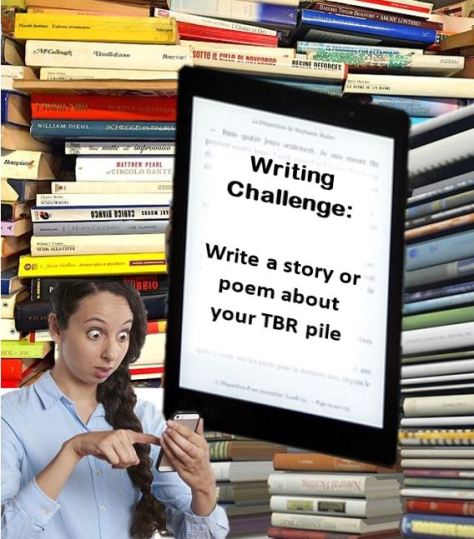 Wonderful writer, reader and reviewer, Diana of Myths of the Mirror blog has thrown down her velvet gauntlet for a fun writing challenge. Here’s what she says: “I don’t know anyone who owns a Kindle (or other ebook reader) and isn’t buried in books. We groan as we add more to the stack… then laugh about it and buy more! That’s my situation anyway.”