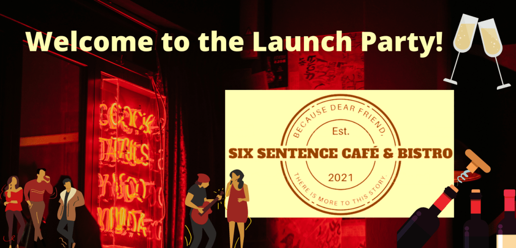 A neon sign lights up the narrow side street which leads to the Six Sentence Café and Bistro where a bearded man waits, watching as a minivan draws up. The driver leans out of her window and waves, and a leather-jacket-clad man wearing dark glasses, despite the lateness of the hour, emerges from the vehicle carrying a box marked ‘books’.