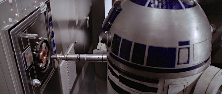 Cee-Threepio and Artoo exchange glances. Artoo emits a series of excited whoops and beeps, while Cee-Threepio raises a golden arm to his forehead as if he is searching his memory banks. ‘Sorry, sir, I don’t quite…’