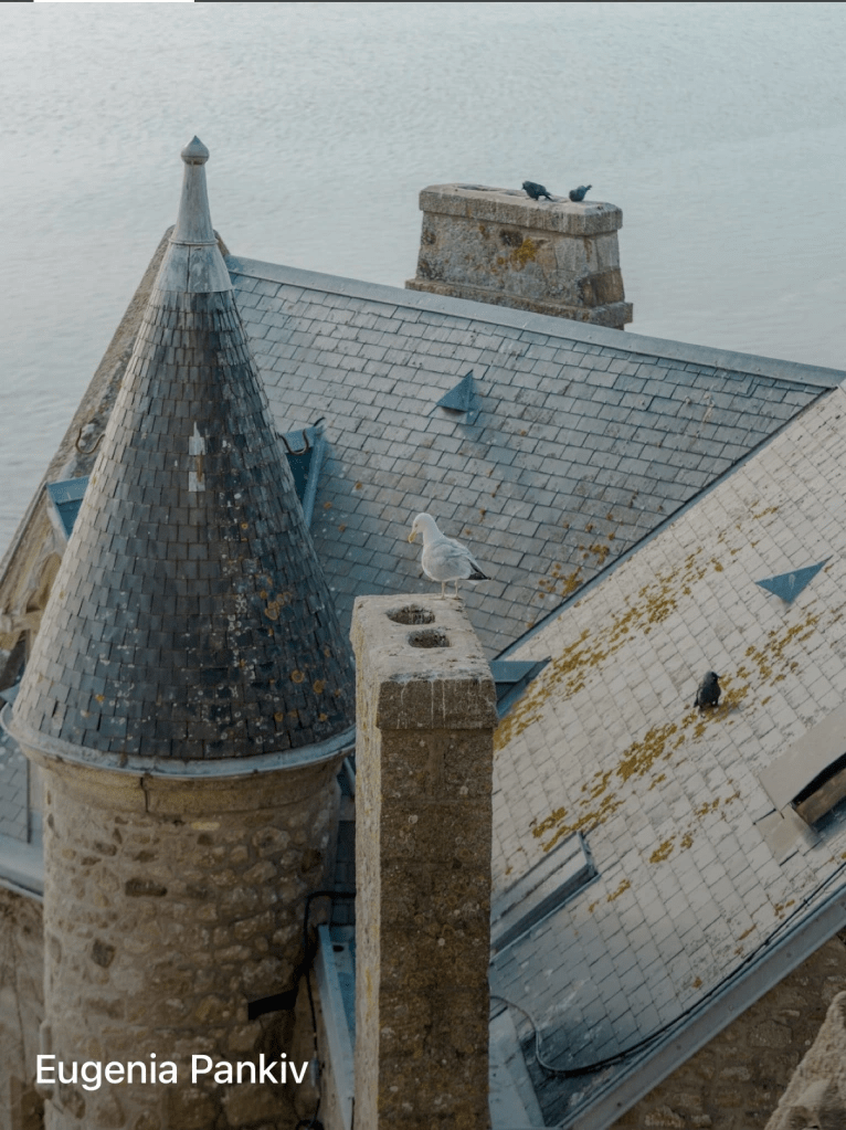 This image shows the rooftop of a building, with turrets and a sloping roofThere are different birds sitting on the roof, including a seagull. There are bird droppings all over the turret, chimney, and the roof.