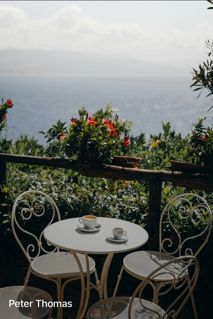 This image shows a table for two, set overlooking a picturesque scene. There are two teacups on the table, one of them is empty while the other is full of tea! In the background, you can see bright orange flowers, and far away mountains are visible too.
