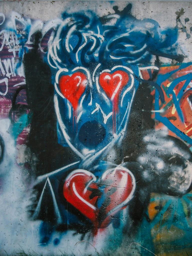 This image is titled “broken heart graffiti.” It shows a sad face painted in blue, with red hearts for eyes, and a heart that is outlined in white and appears to be broken, painted in red with a blue zigzag line in the middleon a white wall.