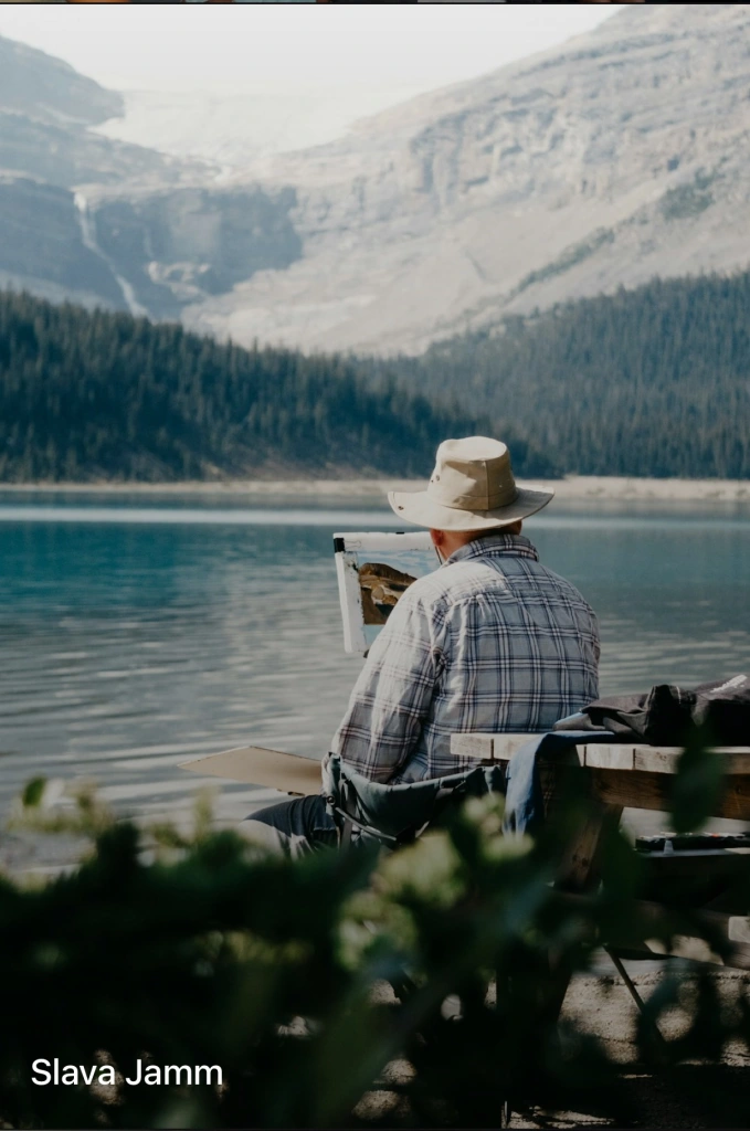 This image shows a man, probably an older man, sitting by the shore of a lake and there is a painting / picture in his hand. It looks like he is trying to capture the scene in front of him on paper / canvas.
