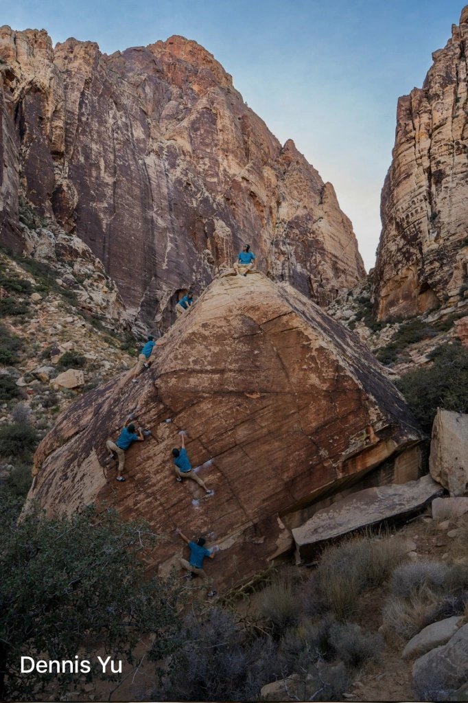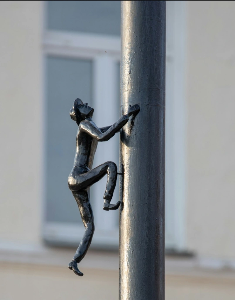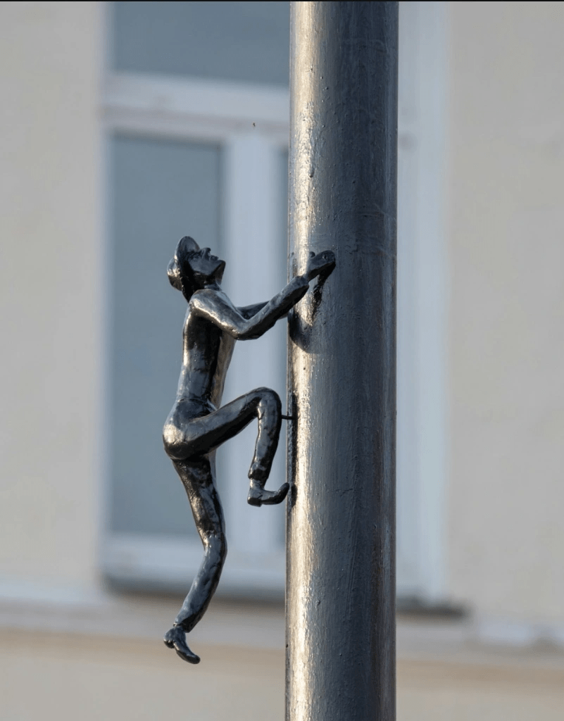 This image shows a small metal statue of a tiny man climbing a pole. The statue is of a man wearing a suit and a hat and looking upwards.